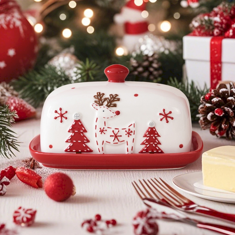 CÉLINO Butter Dish, White and Red Ceramic with Christmas Reindeer Motif