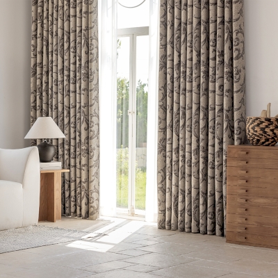 The VOLUTES curtain embodies timeless French elegance. Crafted from a wool-effect jacquard, it impresses with its soft feel, flowing drape, and subtly textured finish.