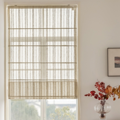 Explore Our Elegant CHAMPSIA Roman Shades!Crafted from a refined linen-blend fabric, these custom Roman shades feature a vertical stripe design that adds both height and sophistication to any room. The semi-sheer voile texture allows natural light to softly filter through, creating a warm and inviting atmosphere while still maintaining privacy. With their timeless striped pattern, the CHAMPSIA shades complement a wide variety of interiors—from minimalist modern to rustic chic—bringing versatility and understated elegance to your windows.