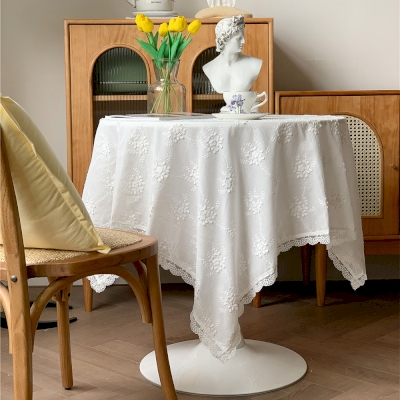 Home > Tablecloths > Elegant White Cotton Tablecloth with Embossed Embroidery and Lace Border, Rectangle Tablecloths, Square Tablecloths, White Tablecloth