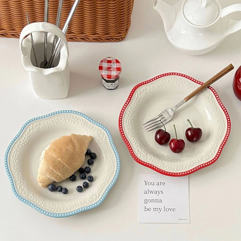 PROFILÉA plates celebrate the tranquility of peaceful mornings and the charm of a French breakfast. Their scalloped edge, enhanced with red and blue polka dots on a cream base, brings a cheerful and subtly retro touch to the table.