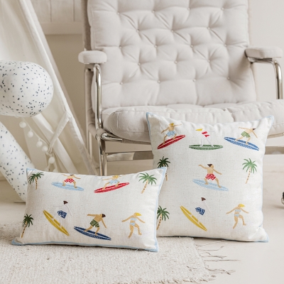 Infuse your space with a fun and vibrant beach vibe with this decorative cushion. Featuring playful embroidery of surfers riding the waves, this throw pillow cover brings the spirit of summer and the ocean into your home. Perfect for adding a lively, coastal touch to any room, it’s an ideal accent for creating a relaxed and sunny atmosphere.