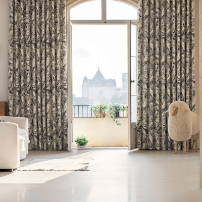 Sylva Wool Curtain, Thermal Bouclette Fabric, Black Leaf Pattern
