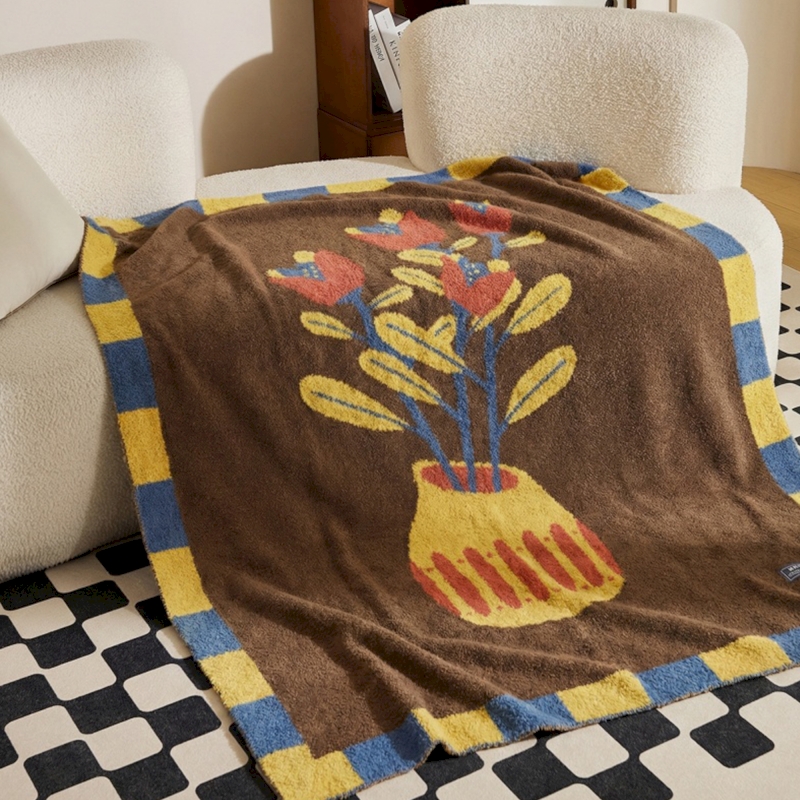 The TALVIA throw is distinguished by its warm palette dominated by a deep brown, which highlights a floral motif in contrasting colors. The luminous ochre vase and coral-red flowers create an expressive focal point, while the deep blue stems structure the composition with a graphic feel. The blue and yellow checkered border frames the whole and adds a dynamic retro touch.