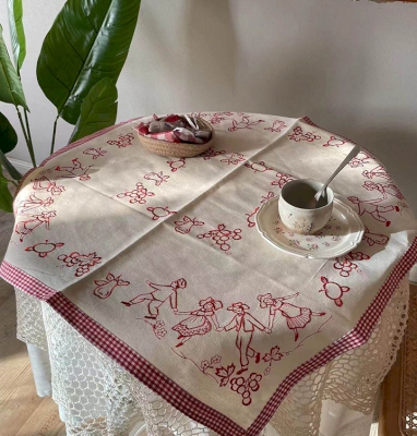 The embroidered tablecloth is distinguished by its delicate design inspired by vintage pastoral illustrations. Against a luminous ecru background, small figures drawn in red outline move among stylized fruits, flowers, and animals, creating a scene full of life and charm. The overall effect evokes the warm atmosphere of country houses and vintage cafes.